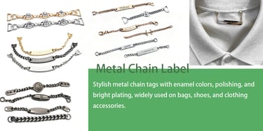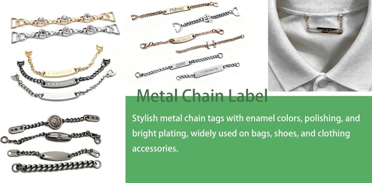 Chain labels add sophistication to handbags, clothing, shoes, and premium packaging. Polished plating, enamel, and engraved logos create a stylish, high-end look, perfect for fashion brands and upscale products.