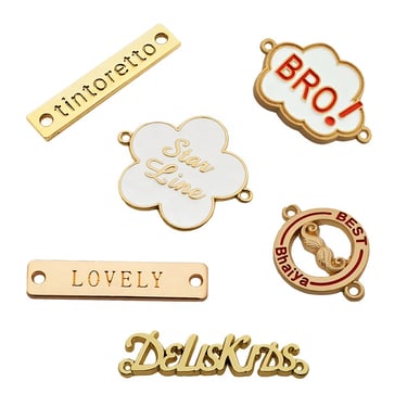 Durable die-cast zinc alloy labels, with enamel coloring, polishing, and electroplated finish. Widely applied to clothing, bags, packaging, and fashion trims.